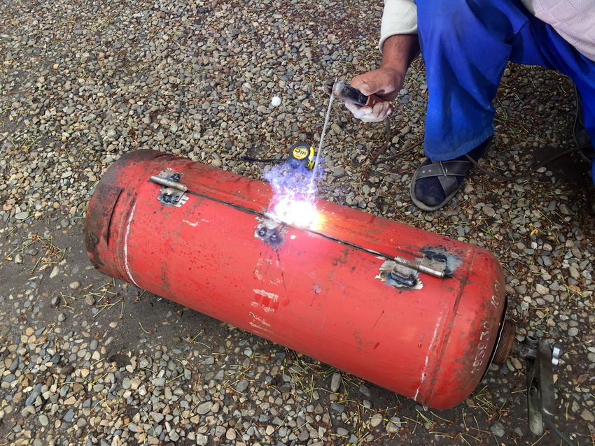 To fasten the hinges, the seats must be cleaned and sanded. The elements are riveted and welded. Next, proceed to the installation of fasteners. After that, the cylinder is cut along the lines. In this case, the cover will rotate but not fall. At this stage, the water from the cylinder can be drained. It is recommended to do this away from residential areas, since methane has a pungent odor that lasts for several days.
