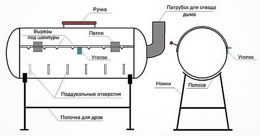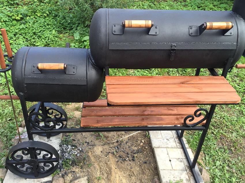 The smoker, which is also called a steam locomotive, is the most complex and multifunctional structure. To manufacture the structure, you will need several cylinders, each of which will perform its own function. This device combines the capabilities of a barbecue, barbecue, smokehouse and grill.