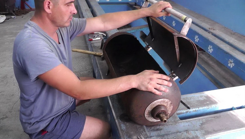 Another design option from a balloon is to create a brazier-smokehouse with your own hands. This device contains an additional element in the form of a firebox. To create it, strips are cut from the bottom of the cylinder, then half of the bottom is cut out. Thus, a place is obtained for organizing the furnace, which is made of dense metal sheets with a thickness of 2-3 mm and is welded to the bottom. The result is a one-piece sealed structure, which is clearly shown in the photo of the smokehouse.