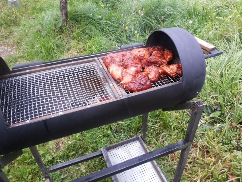A good solution is also to use another barrel mounted on the side cover as a pedestal, where a full-fledged smokehouse is organized. To create a structure, you can use the drawings found on the Internet.