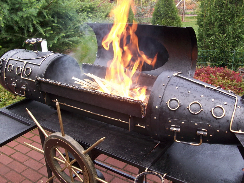 Another unique building is a steam locomotive. The design is made from several cylinders of different diameters, barrels and main pipes. Such a product combines a brazier, smokehouse, barbecue and grill do it yourself. The structure is complemented by forged elements that give the structure an original and aesthetic appearance.