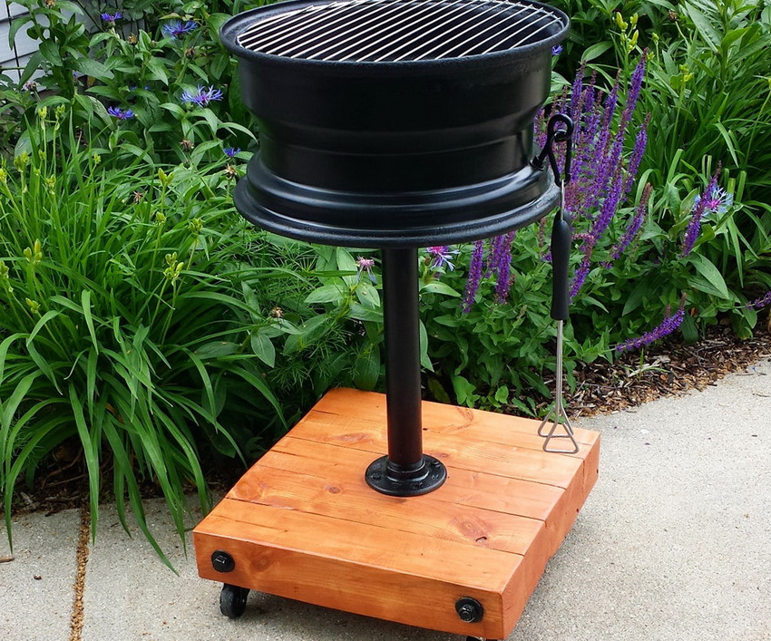 On such a grill, you can fry not only a kebab strung on a skewer, but also prepare a barbecue. For this, the structure should be covered with a metal grill. It would be more appropriate to make it removable. For the convenience of moving the barbecue, handles are welded symmetrically on the sides of the structure. To maintain the heat, a window can be made on the side of the disc.