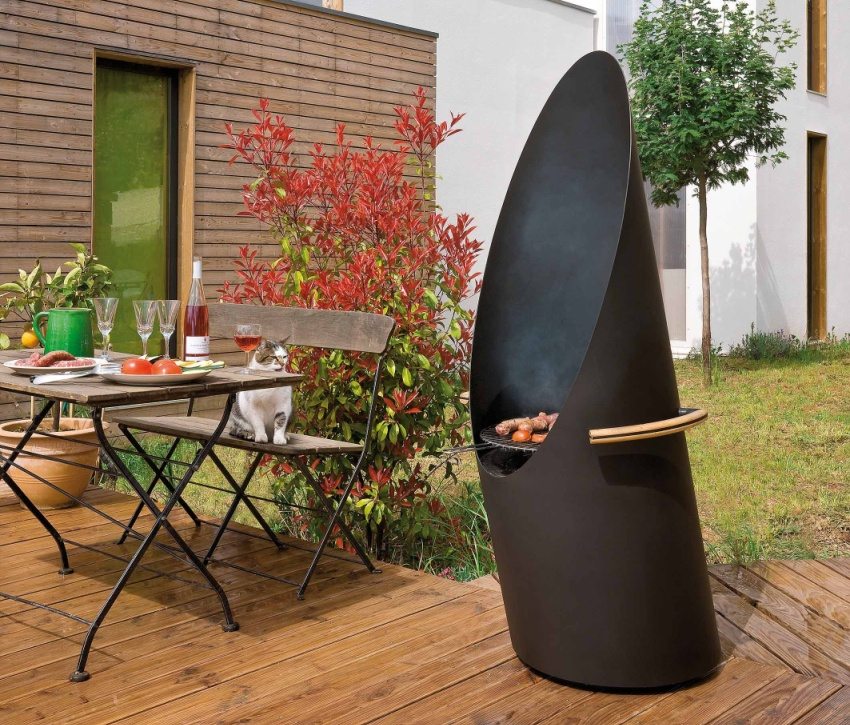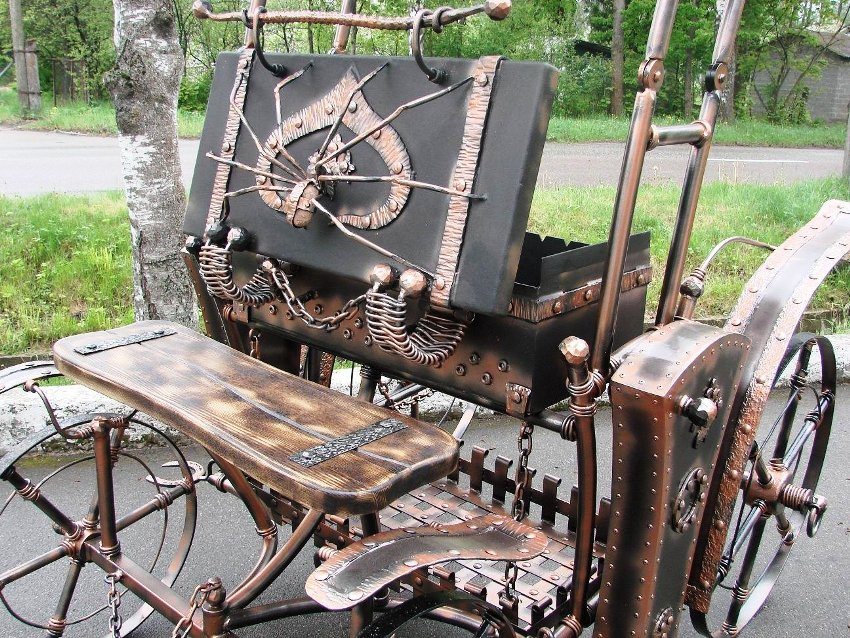 Modern master designers create truly unique designs for frying in the form of pirate chests, small cars or steam locomotives. They are decorated with forged patterns or flowers. Such barbecues will be excellent decorative elements of any summer cottage or house area.