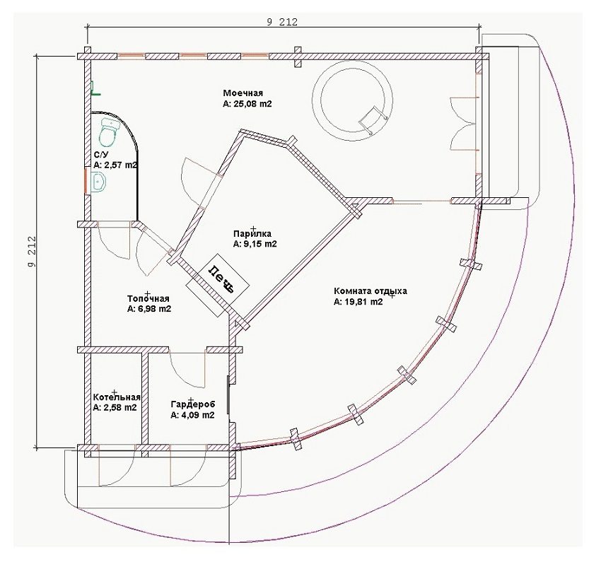 The most budgetary and optimal option is to build a bath with dimensions of 4 x 6 m. In this case, you can divide the entire area by a partition in half, and one of the halves in half or in proportion. In the resulting large room, there is a recreation room, and in the small ones, a washing room and a steam room.