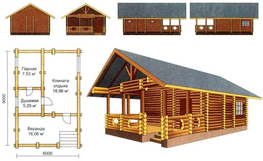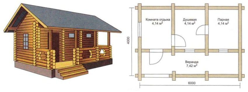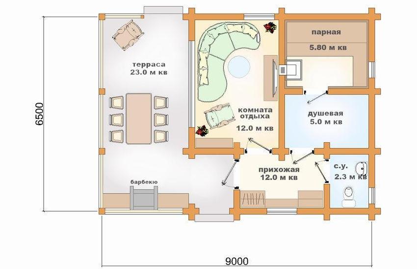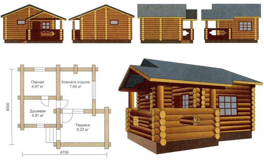 If both the means and the possibilities allow you to build a large structure, then you can successfully choose a project for a bath with a relaxation room and a terrace. This design is more practical and more popular. After all, the terrace for its intended purpose can be used only in the warm season. An additional room indoors, in a warm place, allows you to use the sauna at any time of the year with great benefit.