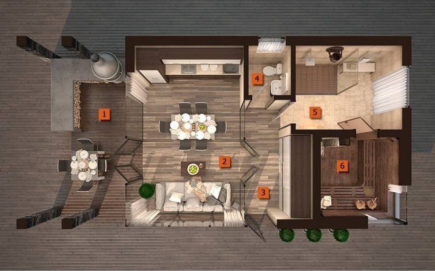 1 - terrace with barbecue, 2 - recreation room, 3 - corridor, 4 - bathroom, 5 - shower room, 6 - steam room