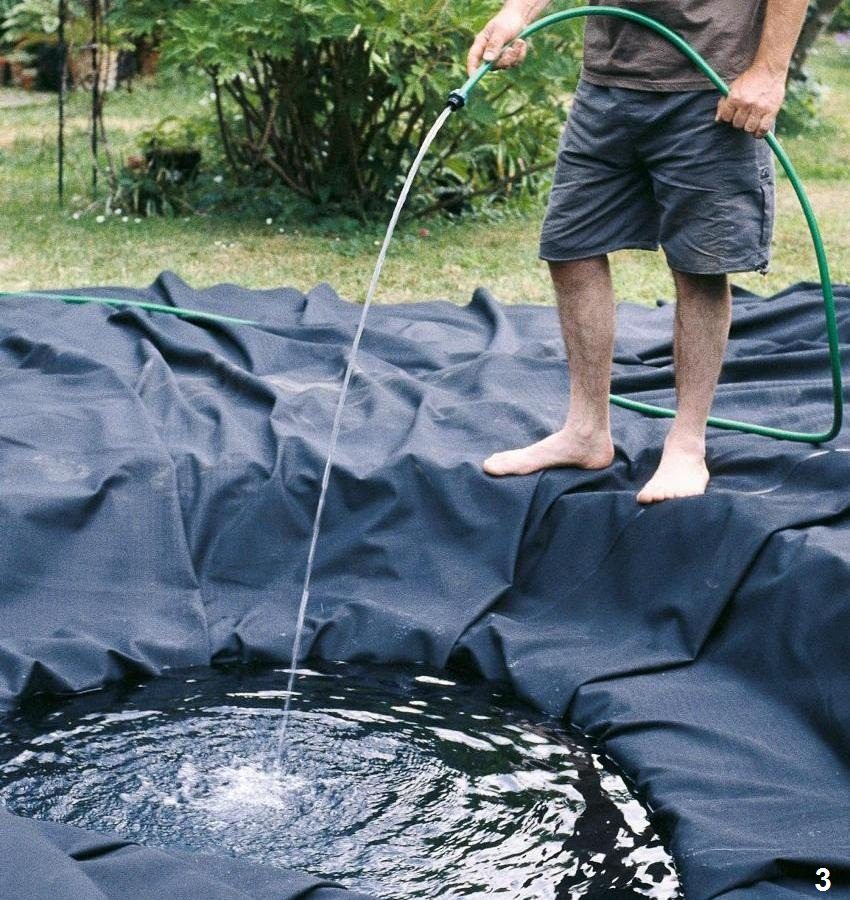 You need to dig a small ditch around the perimeter of the pond, 15-20 cm deep. It will serve as an assistant in securing the edges of the film. Subsequently, they are covered with stones or gravel. The allowance remaining on top should be at least 50 cm, only in this way it will be possible to securely fix the edges of the structure. The finished pond can be filled with water.