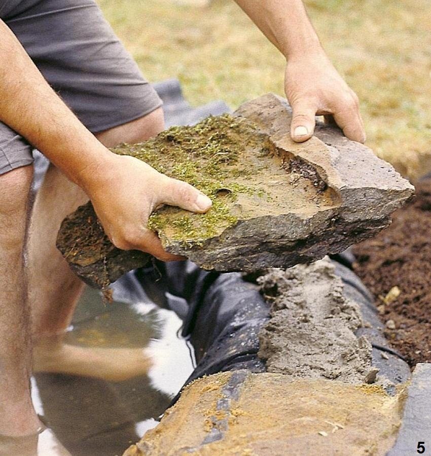 As it is added, the container is filled to the top with water. A wild stone is laid along the edges of the established form or plants are planted. This can be done only after the container has completely shrunk.