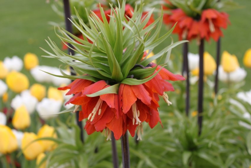 You can pick up low varieties, for example, Alba, Artemis, Aphrodite. They reach 40-50 cm and do not have a crown of leaves above the inflorescence. As you can see in the photo, the imperial hazel grouse flower can have an orange, red or yellow color, its stem reaches 1 m.The leaves are located near the ground, as well as above the inflorescences in the form of a crown. It is better to plant it in partial shade and transplant it to a new place every 2-3 years.