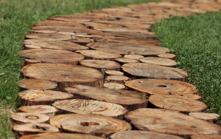 Then a pit is prepared for the path. For this, the sod is removed and sand is poured, which is rammed. Stumps are installed close to each other or at some distance. The gaps are covered with sand or fine gravel.