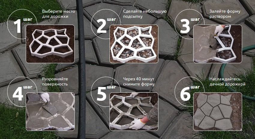 To make a beautiful and modern track, it is enough to install one or several molds in a line and fill them with a solution. After a few hours, the molds are moved further and the next section is poured. Paths built in such an original and convenient way look so presentable, as if they were made of expensive ceramic tiles, if you add dye to the composition.