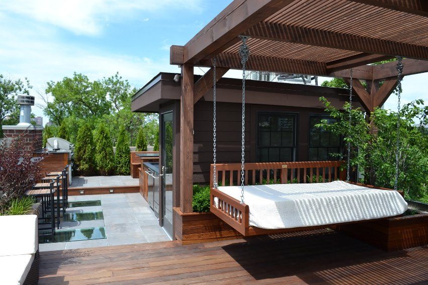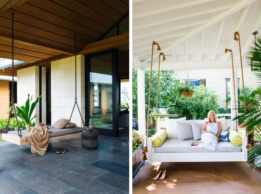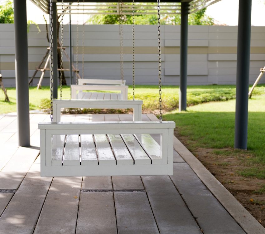 It is recommended to choose the back of the house to place the swing. Even if your site is fenced off from a noisy street and neighbors, this zone will still be the most comfortable and quiet. The backyard in most cases is equipped for relaxation, and you can safely use it to install family or children's outdoor wooden swing for the summer cottage.