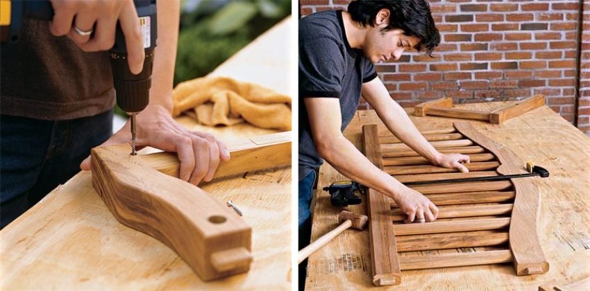 - 3 frame parts for the bench should be formed from the boards. They must be L-shaped. Fixation is carried out with self-tapping screws. Use carpentry tools to fit the frame to the curve of the spine. Thanks to this, you will be able to achieve a comfortable posture for your back while riding;