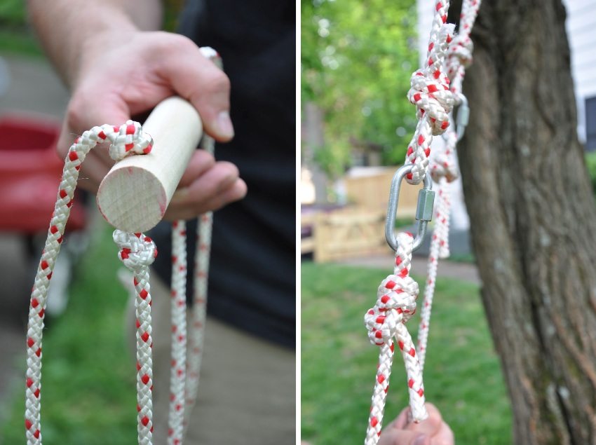 Helpful advice! In order to strengthen the structure, in order to prevent the board from breaking in the area of the holes, an additional board with cut-throughs can be installed under the seat on each side. These holes should be located exactly under those made in the seat. The rope will go through all paired holes.