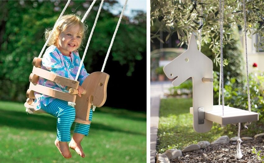 Original baby swing made of wood in the form of a horse