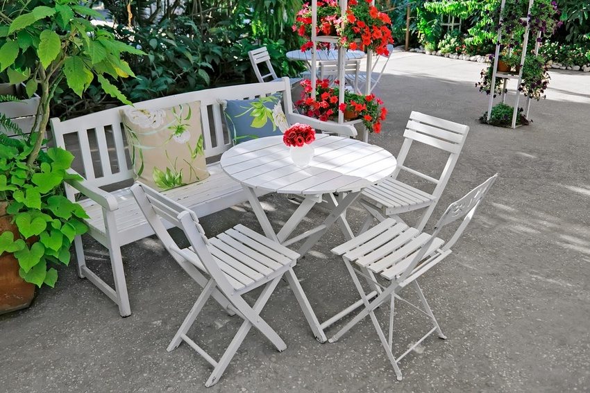The use of metal to create the structural supports has a significant advantage. The legs of products, made entirely of wood, are constantly damp when in contact with the ground and grass. Mold and mildew begin to develop in them, which contributes to a decrease in the service life of the product. Metal is not afraid of such operating conditions.