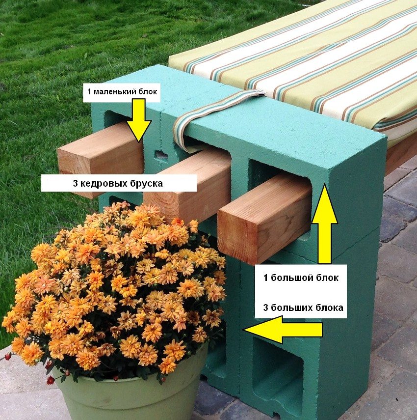 A wooden plank support can be made more durable and reliable by replacing it with a hollow building block. In this case, the seat bars will be fixed in the holes of the supports. Remember to pre-round the edges on the wood to make it more comfortable to sit.