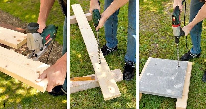 Figure: 1-2. The procedure for making a garden bench from wood and concrete slabs: 1 - preparation of wooden parts; 2 - marking the boards, drilling holes in them; 3 - marking concrete slabs, drilling holes in slabs