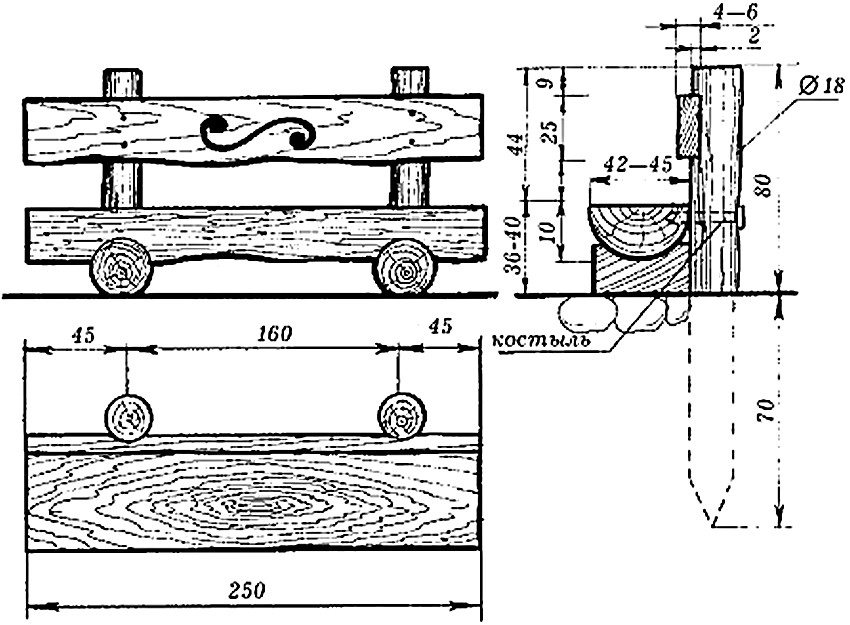 To secure the seat to the support, cut grooves at the top of each stump. The design will be considered correct only if board the seat will fit snugly into the grooves and will be held in them by gravity. For greater security, nails or pin connections can be used.