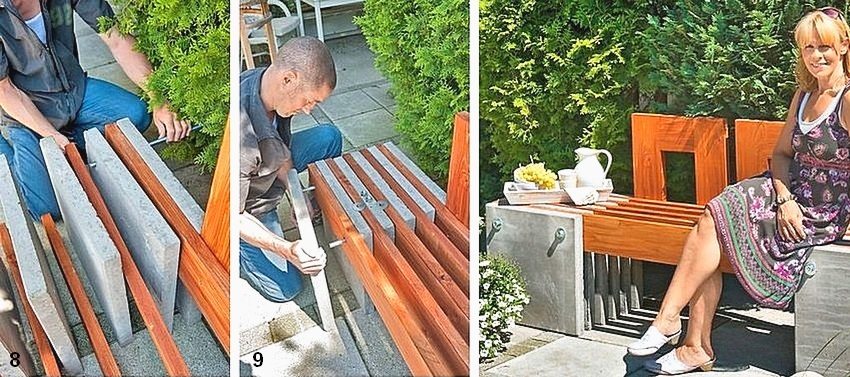 Figure: 1-5. The procedure for making a garden bench from wood and concrete slabs: 8 - assembly of the main part; 9 - insertion and fastening of threaded rods