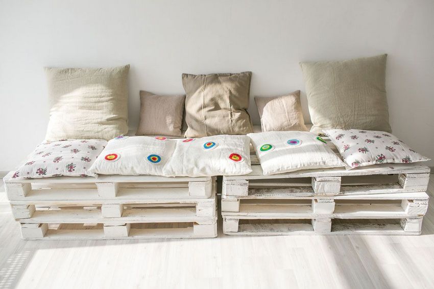 The simplest version of the product is created on the basis of two pallets, fixed to each other at right angles. As a result, the lower pallet will be a seat, and the upper one can be used as a backrest. The pallets can be trimmed slightly to make the structure more neat and harmonious. Fixation is carried out using a screwdriver and self-tapping screws.