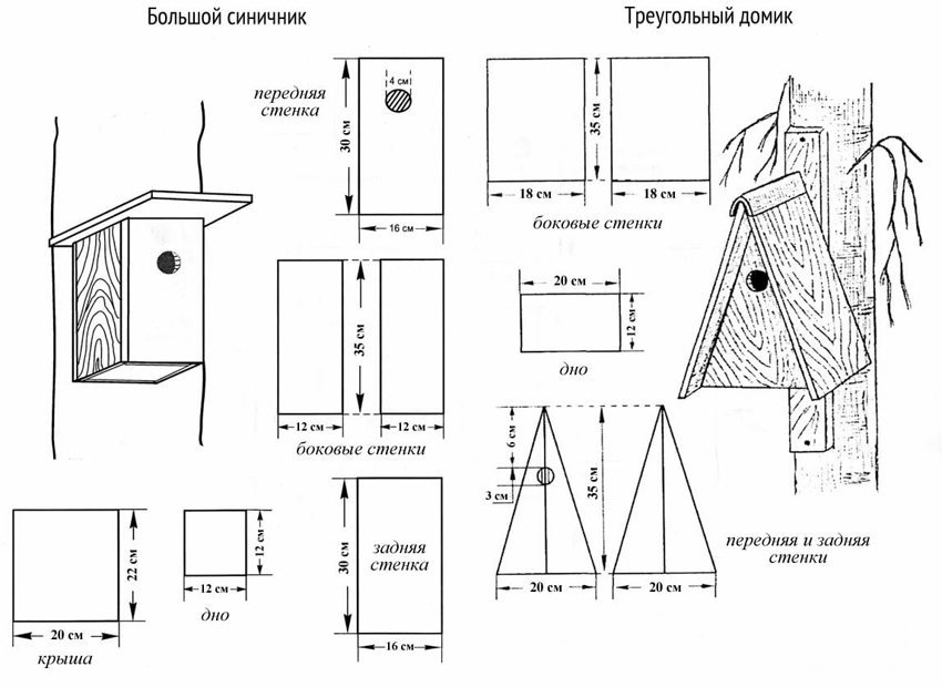In the classic version, the birdhouse looks like a rectangular box. There are designs with a single or gable roof. To create a birdhouse with your own hands from wood, the dimensions can be taken from ready-made schemes, because not everyone has enough experience to develop a drawing on their own. On the Internet, you can find a lot of examples of such designs and choose the right one.