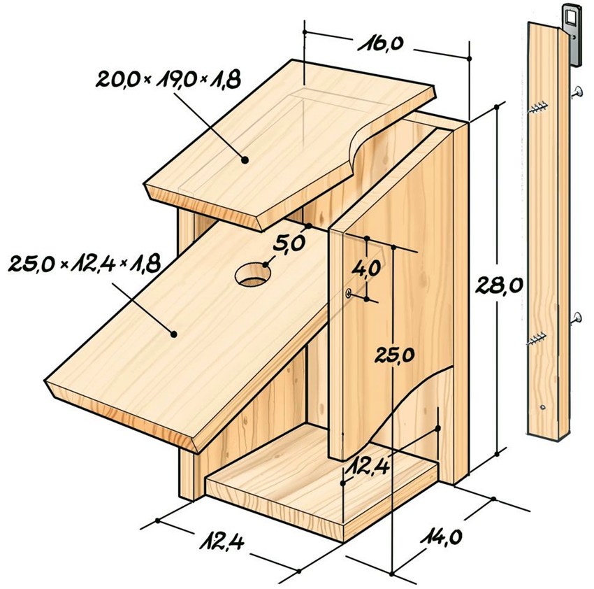 How to make a birdhouse: drawings and dimensions of a structure with a pitched roof