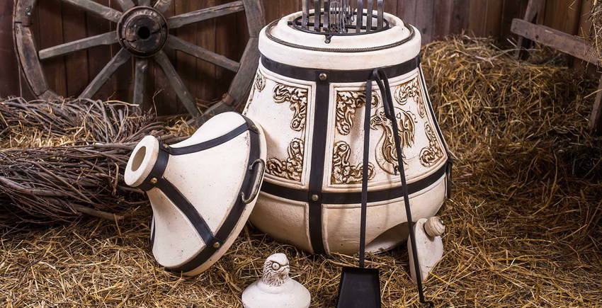 The jug is made of baked white clay and placed inside a metal body. For long-term preservation of heat, the voids are filled with heat-insulating material in the form of sand, fine expanded clay or salt. Gas ovens are easy to operate, do not emit harmful substances and are economical. However, the dishes do not have the characteristic smoke smell.