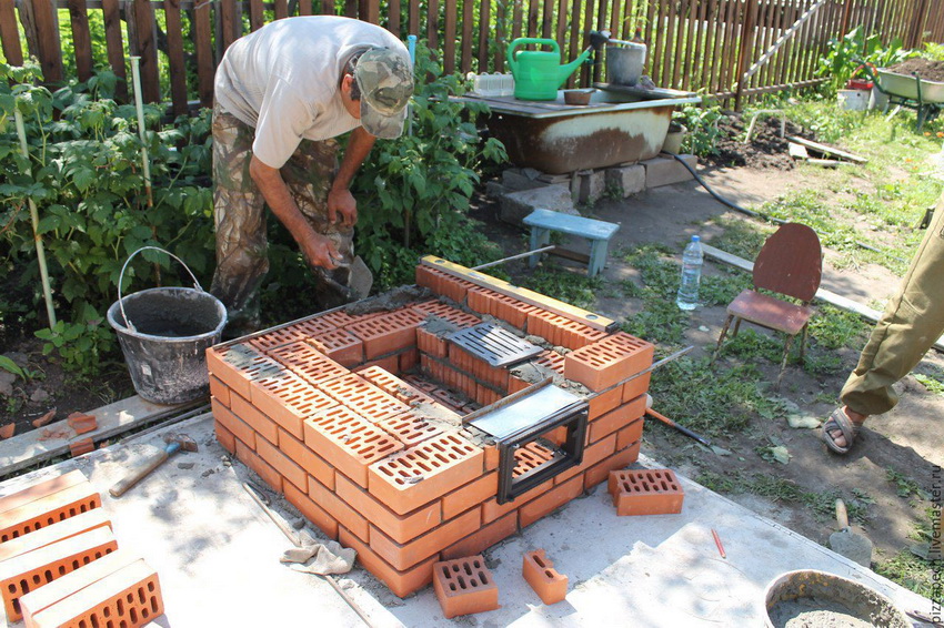 After the concrete base has completely dried, the formwork is removed. The surface is marked according to the dimensions of the clay insert for the construction of a brick wall. First, a brick site is performed with an open area for arranging the blower chamber channel, which is closed with a special door. You can mount a metal pipe in a brick inlay. It is recommended to install a damper in it, thanks to which the amount of incoming air is regulated. The damper can be closed completely.