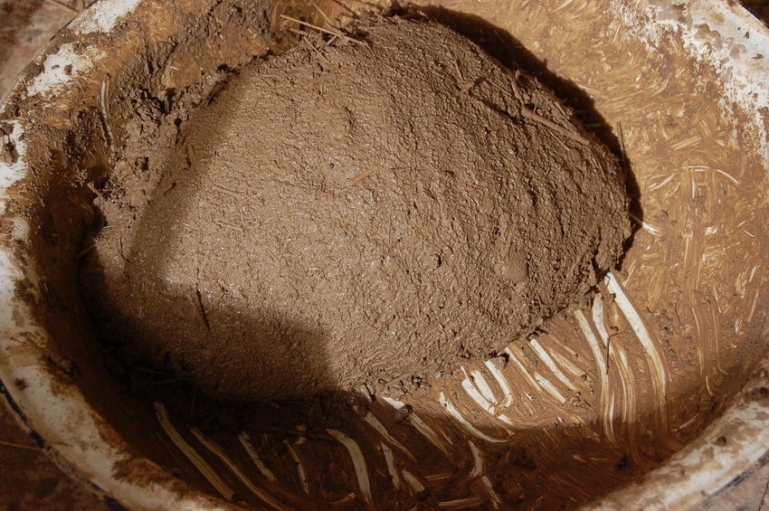 Clay is preliminarily cleaned of impurities, wiped through a sieve, mixed and soaked for 48 hours. The remaining elements are added to the prepared substance. The mixture is thoroughly mixed until a viscous state is formed, reminiscent of the consistency of sour cream. Next, the prepared composition should be left for 7 days so that it dries and acquires the necessary condition. During this period, the mixture should be periodically stirred to ensure its uniform drying. The water collecting from the top must be drained.