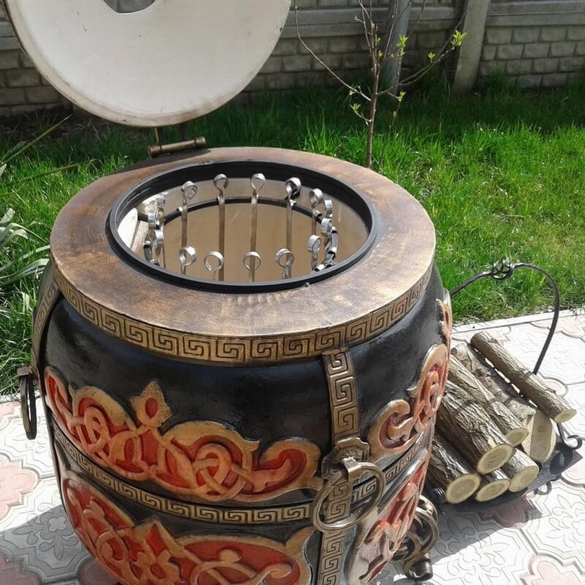 The portable tandoor can be installed anywhere. The product is made of chamotte clay in the form of a barrel or jug. There are four types of tandoor depending on the weight of the oven: small (up to 50 kg), medium (50-79 kg), large (80-100 kg), very large (over 100 kg). This design is additionally equipped with carrying handles and legs on which it is installed. Also included with the product are skewers, grates, hooks and attachments.