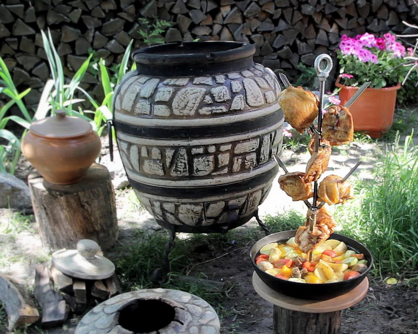 Earthen, or pit, tandoor partially or completely sinks into the ground. The ignition is carried out through the upper opening, which also serves for loading food.To maintain the required traction, a pipe is brought to the bottom of the product, which is buried in the ground at an angle of 450.