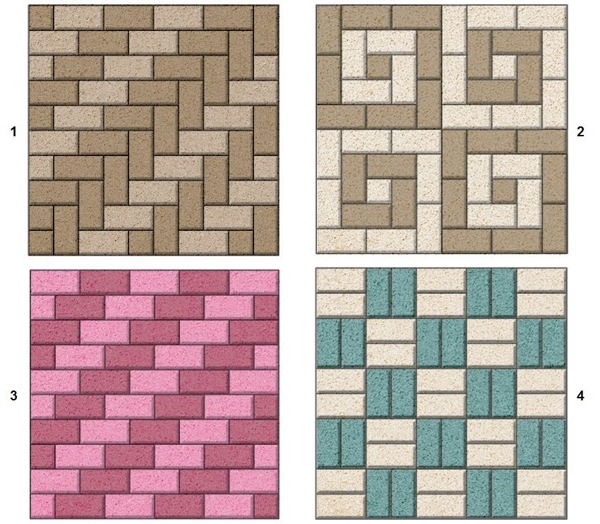 Examples of simple layouts for paving slabs: 1 - herringbone, 2 - spiral, 3 - ladder, 4 - checkerboard