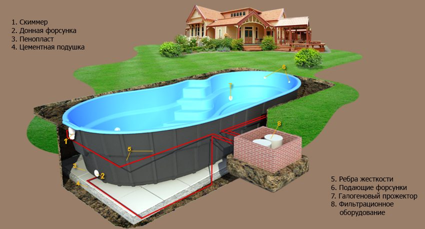 In order for the pool to function fully, it will need to be equipped with pumping and filtering devices. In the places provided for by the project, holes of the required diameter are made. In these holes, pipes are attached for supplying and draining water. It is worth taking care that all pipes and devices have high-quality thermal insulation.