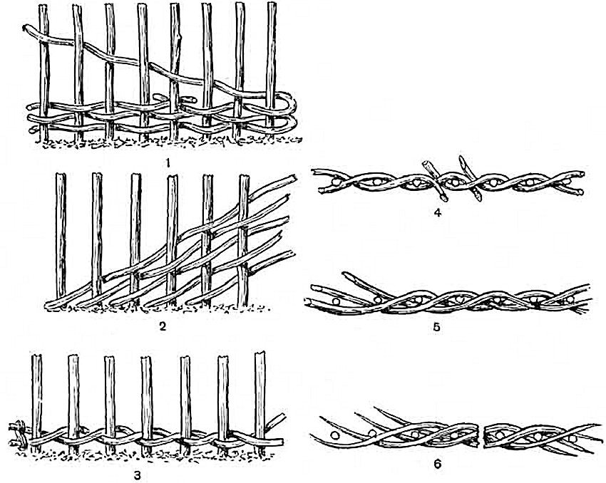 If horizontal weaving is chosen, it starts from the bottom row and ends at the top. The supporting pillars are wrapped in a vine in the form of a "figure eight". In order for the fence not to warp, it is necessary to nail the upper ends of the wooden supports to a flat bar, which is removed before weaving the last row. To give the fence an aesthetic look, you need to make sure that the ends of the branches are located on the back of the fence.