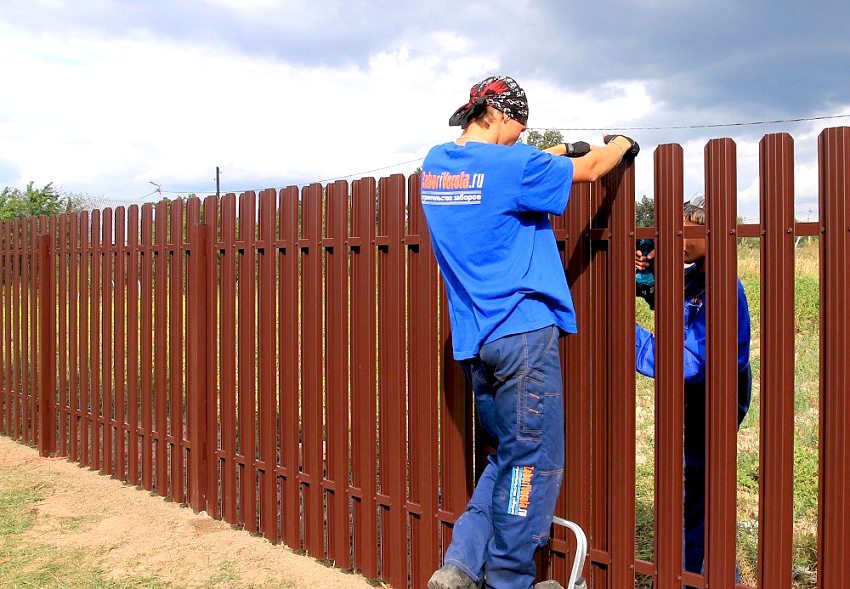 For fixing the picket fence, only galvanized self-tapping screws are used. In this case, the attachment points will not corrode. Self-tapping screws can be purchased in the same color as the picket cover. Each strip is fixed at four points along its height. The step between the plates is selected individually and can be from 1 to 10 cm.