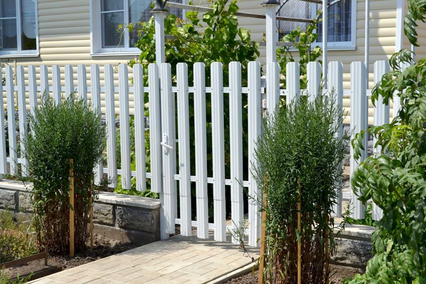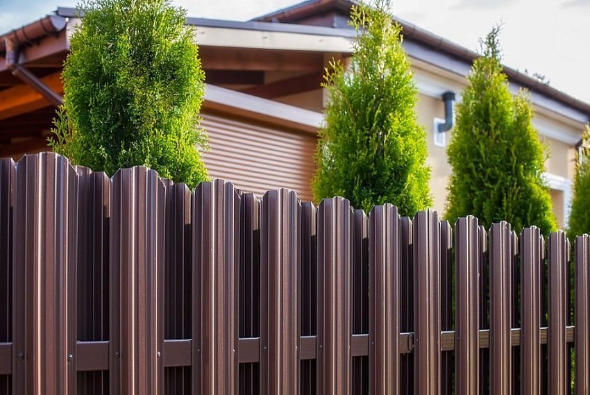A fence made of a metal picket fence (the photo clearly demonstrates this) is not only reliable protection and securing the boundaries of the site, but also serves as a stylish garden accessory that decorates the local area. Due to the fact that the picket fence is available in a wide range of colors, you can choose the desired color in harmony with the roof or facade cladding of the main house.