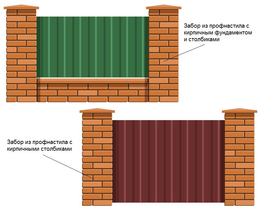 DIY fence made of corrugated board with columns: metal supports or brick pillars