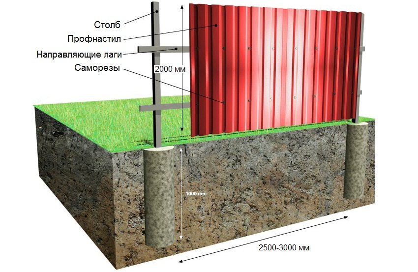 Supporting metal pipes are installed in prepared pits. At the locations of the marks for the supports, holes are drilled to the depth of the pillars. The length of the support pipes is determined based on the height fence and taking into account the depth of immersion. For reliability, a third of the total length of the pipe is lowered into the ground. Pits are arranged with a drill around the entire perimeter at the same distance.