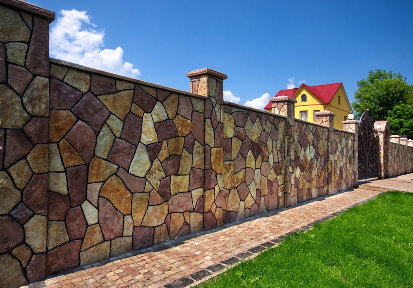 Modern concrete fences are pillars with grooves into which panels are inserted. Color, texture, pattern of slabs can be the most unpredictable. Thanks to the use of advanced casting technologies, the concrete surface is given a texture that imitates different types of material, including wood and natural stone.