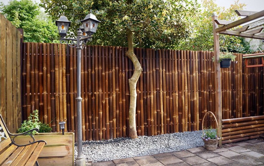 The fence is functional, on the back side of which there are numerous wooden shelves. They not only act as a decor, but are also used to store garden tools. The construction of a fence made of poles, stylized as an American ranch, will not require much time and effort, but it will be able to protect the territory. Quite interesting is a bamboo hedge, which is not afraid of moisture and is not subject to decay.