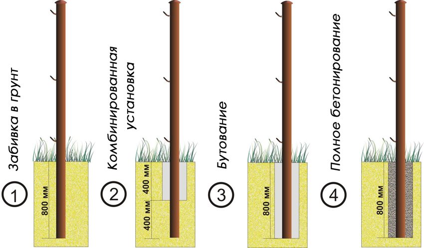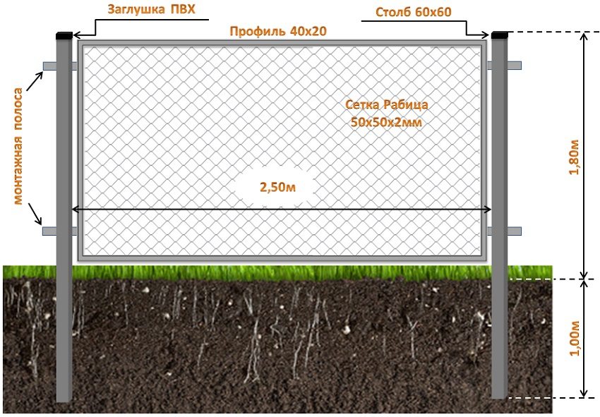 For supports, a profile pipe of square or rectangular section 60 × 40 mm or 60 × 60 mm with a wall thickness of 2 mm is used. Poles can be installed in several ways depending on the type of soil on the site.With the usual method, it is enough to bury the posts in the ground by 0.9-1 m, and concretize the upper part of the pillar submerged in the ground (about 20 cm from the ground level). The supports are located at a distance of 2.5 m from each other.