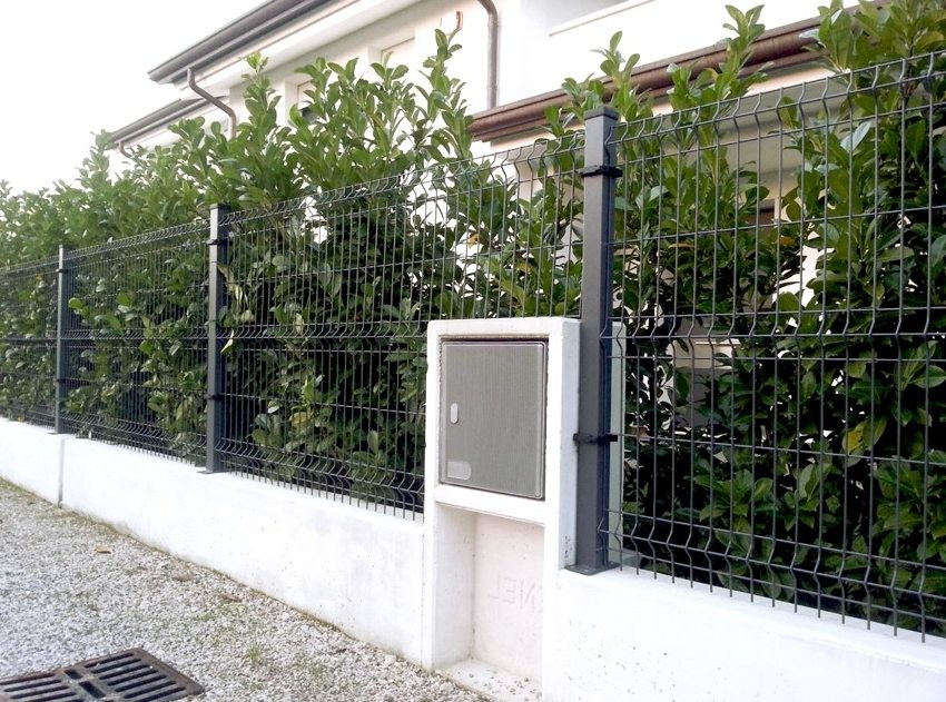 To exclude the ingrowth of the mesh into the ground, a strip base is arranged under the hedge. In this case, the bottom end of the mesh runs along the concrete parapet, due to which the material is less susceptible to corrosion. The line of such a fence looks even and clear, and if you veneer the parapet with a stone, you get a pretty nice structure. The cost of such a fence will be higher, but in this way you can protect the area from the entry of small animals.