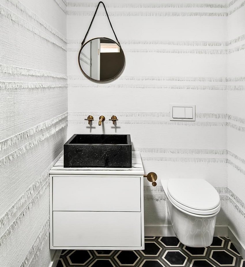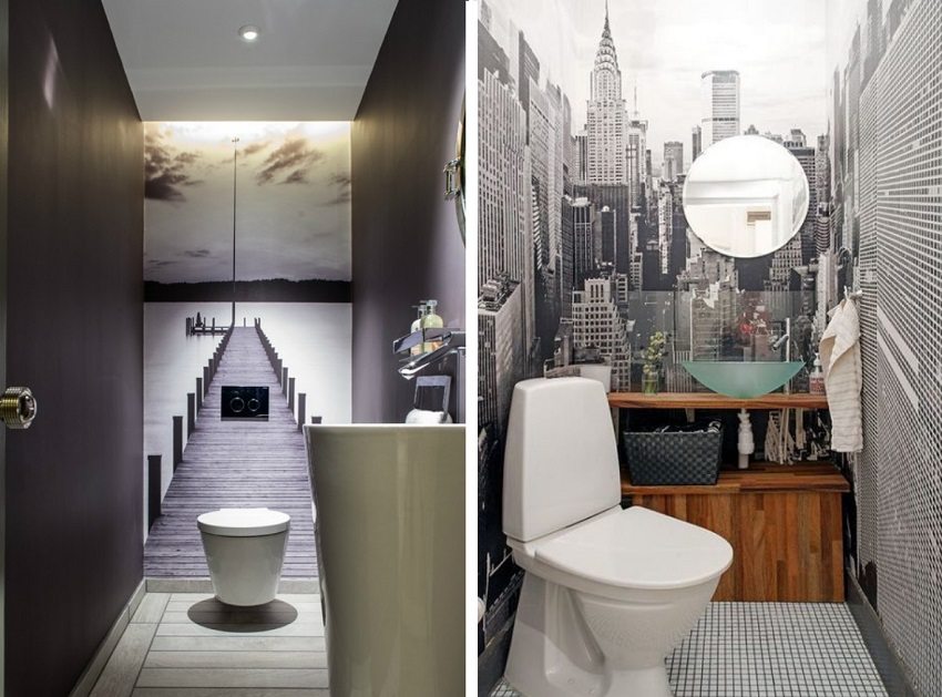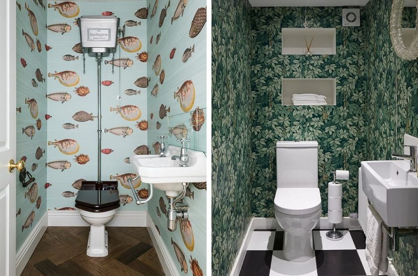 Photos of wallpaper for a toilet in an apartment demonstrate that even the smallest room in which plumbing can hardly fit can be visually enlarged due to the correct choice of pattern and color. The best option is one bright spot (ornament, drawing, etc.) against a background of pastel colors.