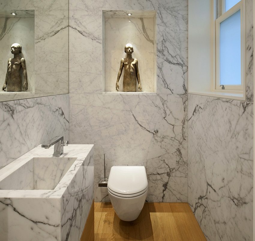 Decorating the walls and floors in the toilet with artificial or natural marble is also a very practical option, which will be quite expensive, but it will demonstrate to all guests your good taste and financial situation. Marble is one of the most durable materials for decoration, it is not afraid of corrosion, moisture, does not wipe out over time, looks luxurious. Its only drawback is the high price, but it's worth it.