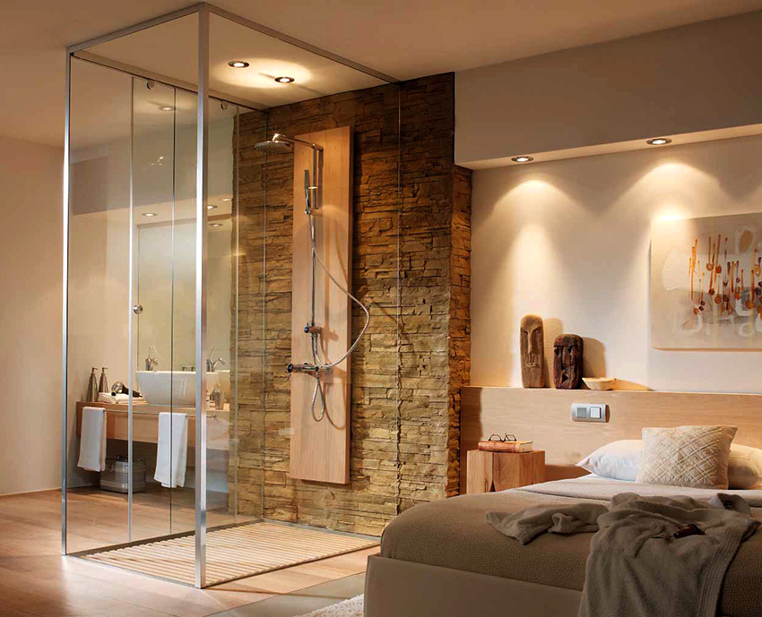 For the manufacture of side walls, transparent, translucent silicate glass or plexiglass is used. Monolithic polycarbonate is also used, which can take any shape. Doors open with a swing or sliding method. The first option requires additional space. Variations of closed boxes can be seen in the photo of bathroom renovations with a shower.