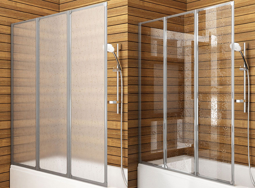 Security elements of shower stalls are made of acrylic or impact-resistant glass. Acrylic doors and walls vary in color and transparency. A decorative film with a pattern can be applied to the surface, which is selected for a specific interior of the room. The material is demanding in care. After each water treatment, the surface should be wiped off immediately. Otherwise, stains will remain on it, which cannot be eliminated over time, which will lead to clouding of the structure. You can buy an acrylic shower door in a 100 cm niche from 18 thousand rubles.
