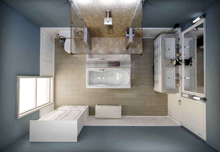 Along one of the walls, you can place a combined shower cubicle with a sliding shower door into a 120 cm niche, organizing an additional Jacuzzi. Floor cabinets or pencil cases can be placed around the perimeter of the room.
