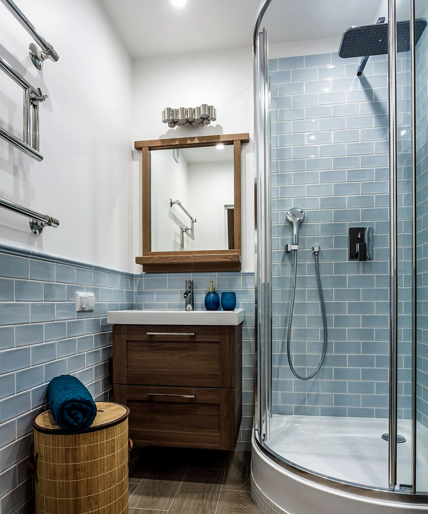 For small apartments, a combined bathroom with a shower is often performed. The structure usually occupies an area of at least 1 m². You can additionally save space by installing a hinged sink and toilet. It is recommended to organize a cabinet under the washbasin for various bath accessories.