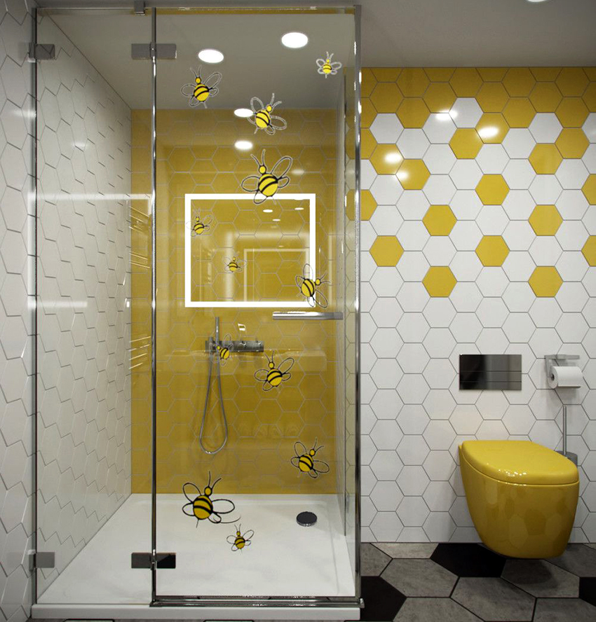 A small bathroom with a shower cabin in a yellow or orange palette, complemented by glass or mirrored surfaces, looks cheerful and sunny. In order for the room to shine with bright colors, it is important to organize intense warm lighting.